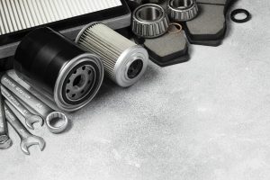 Peças para carro alinhadas sobre um fundo cinza